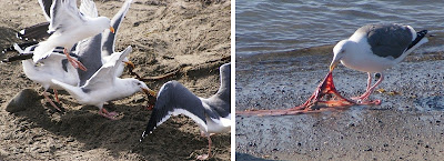 After a pup is born, the mom often tries to hide the bloody afterbirth by covering it up with sand. But, the sharp eyes of the clean-up crews of gulls will soon hone in on this delicacy and down they'll swoop.